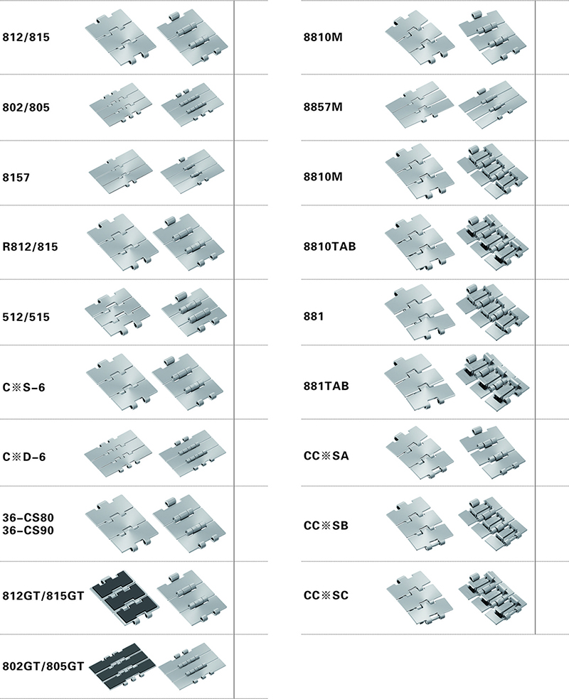 不锈钢平顶链的技术性能主要取决于其原材料和制造过程的工艺技术水平。不同的金属材料特性决定了平顶链产品的适用环境和工况条件。目前可供选择的链板材料有AISI 420、AISI 430、AISI 304和特殊铬镍钢四种,销轴材料有AISI 420、AISI 431、AISI 304三种。其中AISI 420链板与AISI 420销轴、AISI 430和特殊铬镍钢链板与AISI 431销轴、AISI 304链板与AISI 431或AISI 304销轴的基于材料匹配的五种装配方式。